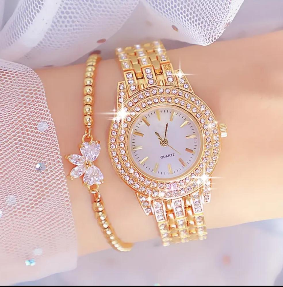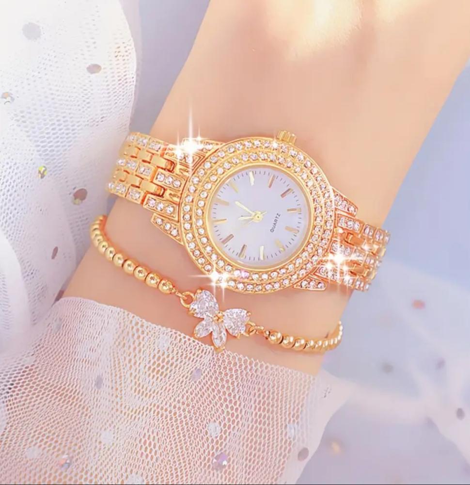 ساعة أنيقة بتصميم ملكي ولمسة براقة، تأتي مع سوار أنثوي على شكل فراشة مرصع بالأحجار اللامعة ليكمل جمالك بكل مناسبة 🦋💖