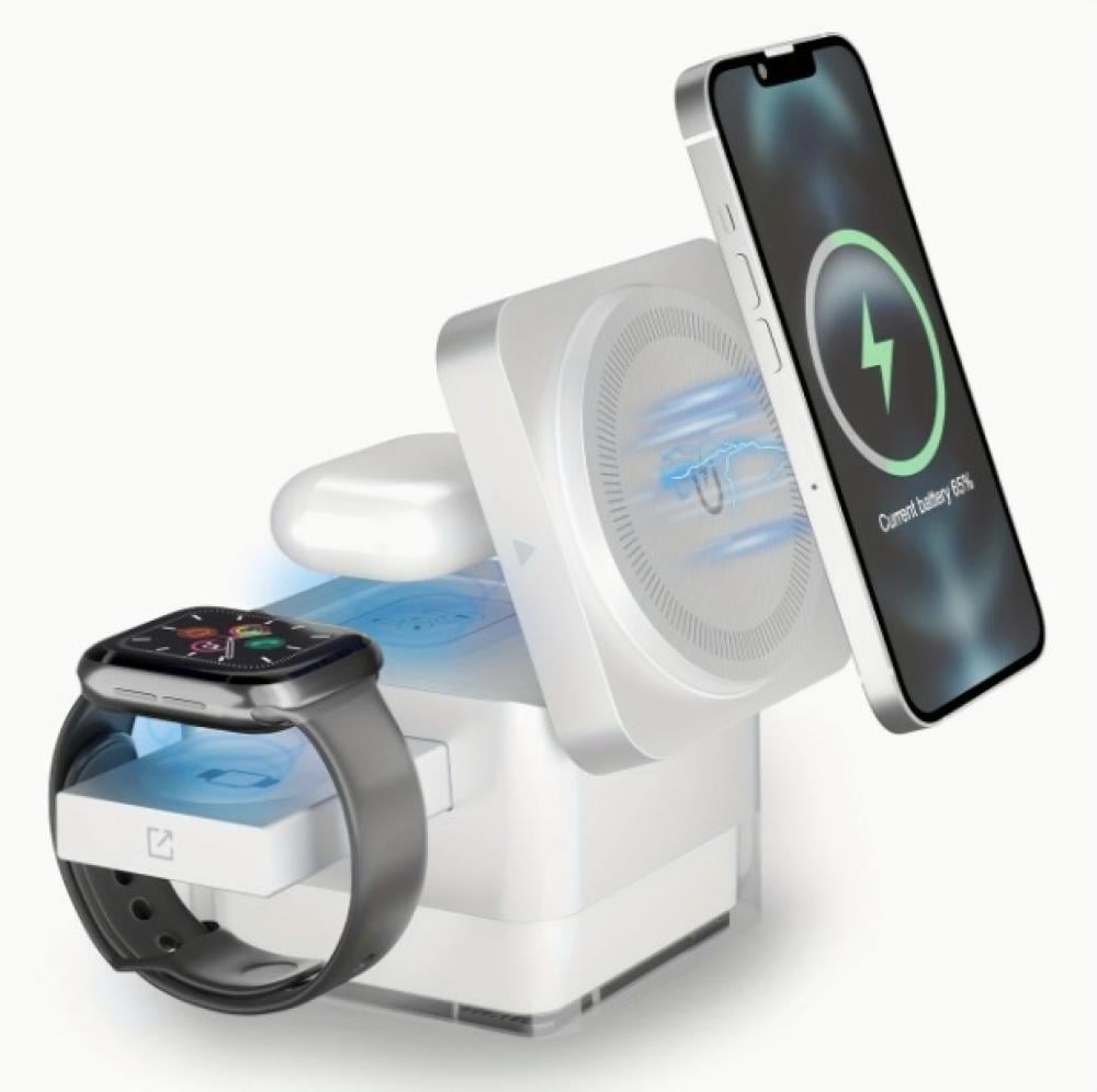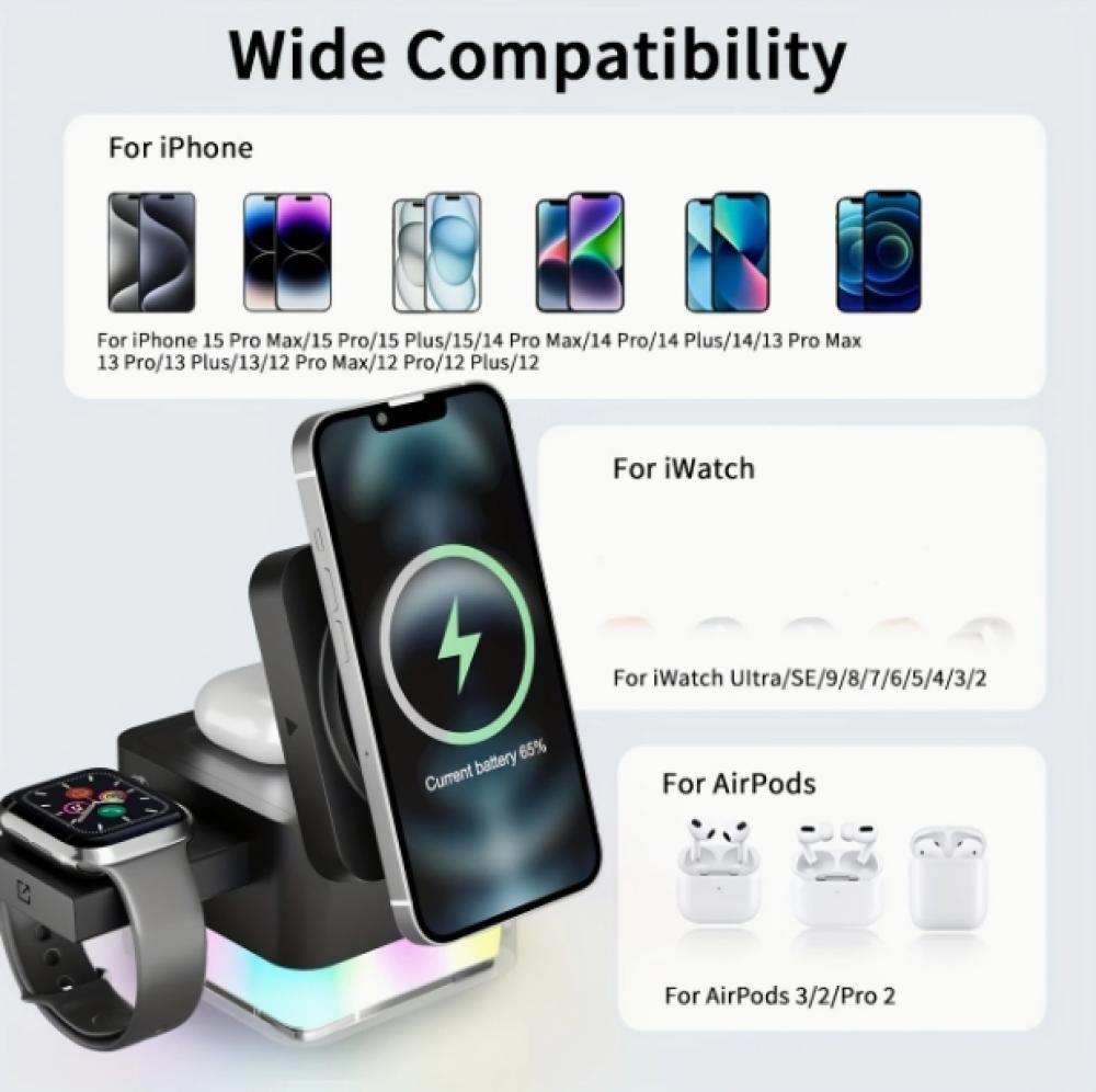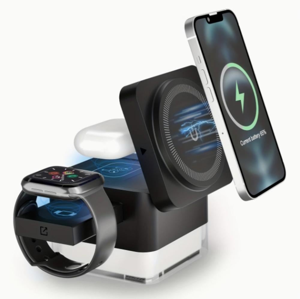 شحن لاسلكي متعدد الوظائف يجمع بين الأداء القوي والتصميم الذكي، متوافق مع أجهزة iPhone وiWatch وAirPods. تجربة شحن مريحة وسريعة من مكان واحد، مثالي للاستخدام في المكتب أو بجانب السرير، ويوفر تنظيمًا أنيقًا وخاليًا من الكابلات.